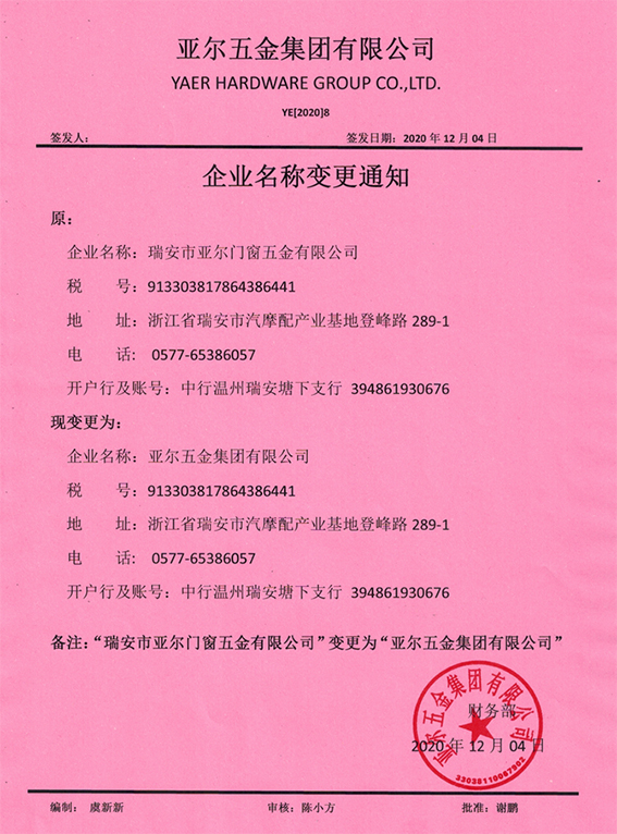 本公司已于2020年12月04日正式更名為“亞爾五金集團(tuán)有限公司”!
